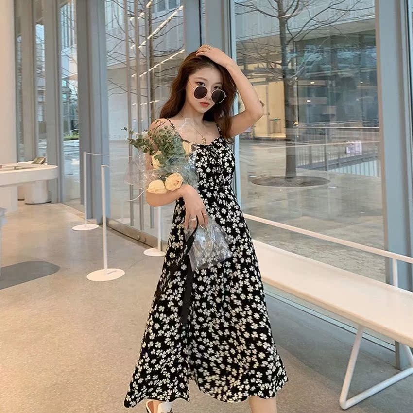 法式连衣裙夏季新款初恋黑色桔梗裙设计感小众吊带开叉碎花裙子潮热门设计联盟服务商
